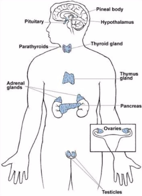 Hệ nội tiết là một hệ thống các tuyến, mỗi tuyến tiết ra một loại hormone theo máu chuyển đến và tạo tác động tại những cơ quan khác nhau để điều hòa cơ thể. Hệ thống này bao gồm tuyến yên, vùng dưới đồi, tuyến tùng, tuyến giáp, tuyến cận giáp và tuyến thượng thận.