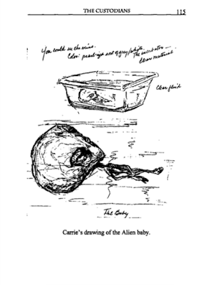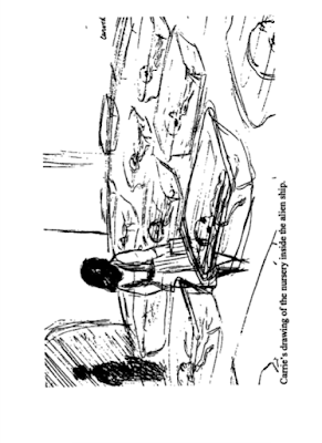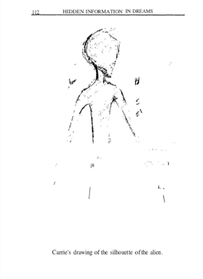 “Trong những năm kể từ sau sự kiện này, tôi được biết rằng một số nhà điều tra khác đã có được bản sao của bức vẽ về bọn trẻ. Một vài trong số họ nói rằng đó là một ví dụ về cuộc thử nghiệm lai tạo giữa loài người và người ngoài hành tinh, nhưng giả thuyết đó hoàn toàn đi ngược lại với những gì Carrie đã nói khi bị thôi miên. Cô khẳng định rằng những đứa trẻ không phải loài người, mà là người ngoài hành tinh. Bức tranh mà cô đã gửi tôi, vẽ về bên trong của một chiếc phi thuyền, cho thấy rằng trong suốt trải nghiệm kéo dài này, hẳn cô đã có lúc ở bên ngoài căn phòng đó. Tôi đã trình chiếu những bức vẽ này trong các buổi diễn thuyết của mình nhiều năm qua. Tôi đã luôn mô tả bức vẽ đó là về phần bên trong của một phi thuyền mẹ khổng lồ có nhiều tầng. Giờ đây khi viết những dòng này, tôi tự hỏi liệu có kiến giải nào khác hay không. Liệu cô ấy có thể đã ở trong một cơ sở thí nghiệm dưới lòng đất? Ý nghĩ này nảy ra trong đầu tôi vì cô ấy đã đề cập đến một môi trường kiểu quân sự, và thực tế là có một nhân viên khác ở đó có vẻ là con người. Cô chưa bao giờ nói nơi đó ở đâu, chỉ nói rằng mình tỉnh dậy đã ở đó. Cô không bao giờ nói được làm thế nào mình đã được đưa đến nơi đó. Tôi đã cho rằng đó là một phi thuyền mẹ, vì theo kinh nghiệm của tôi, đó là thứ duy nhất có thể hình dung ra mà đủ lớn để chứa được cả một cơ sở như vậy. Giờ đây, tôi lại tự hỏi.”